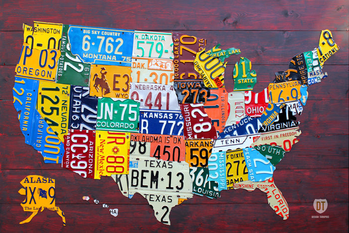 These extra large license plate maps are created using vintage genuine plates from all 50 states! Dominating the room, they make lifelong conversation pieces and add "wow" factor to any space, whether it's your home, business or a retail setting. Each map is a unique handmade creation made as ordered, incorporating bold colors and mounted on rich distressed wood planks. Guaranteed to get many admiring comments from friends, family, employees and clients!